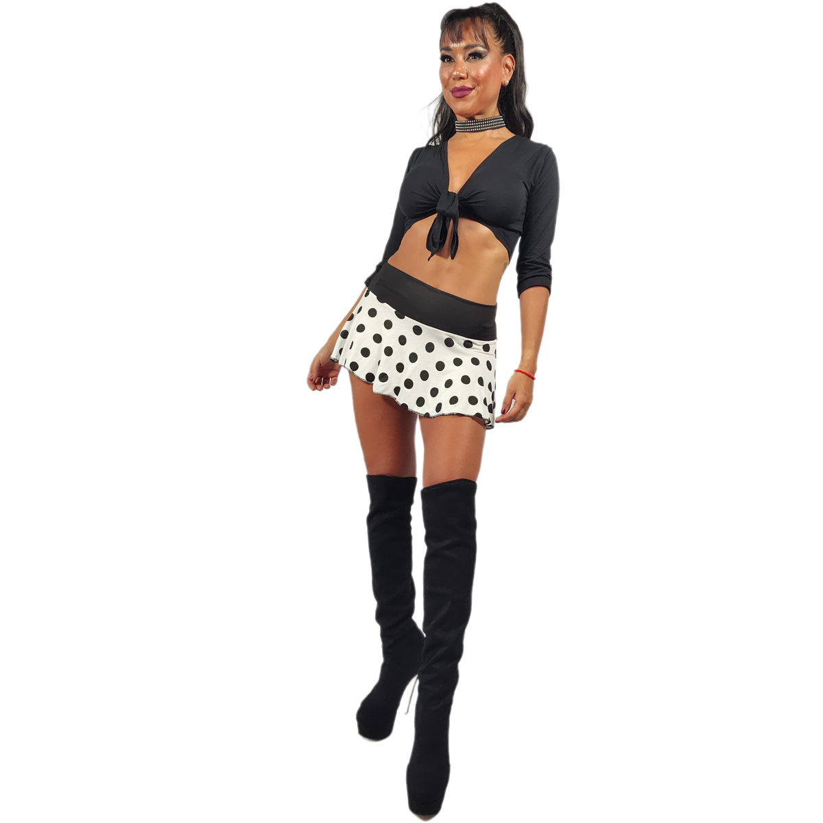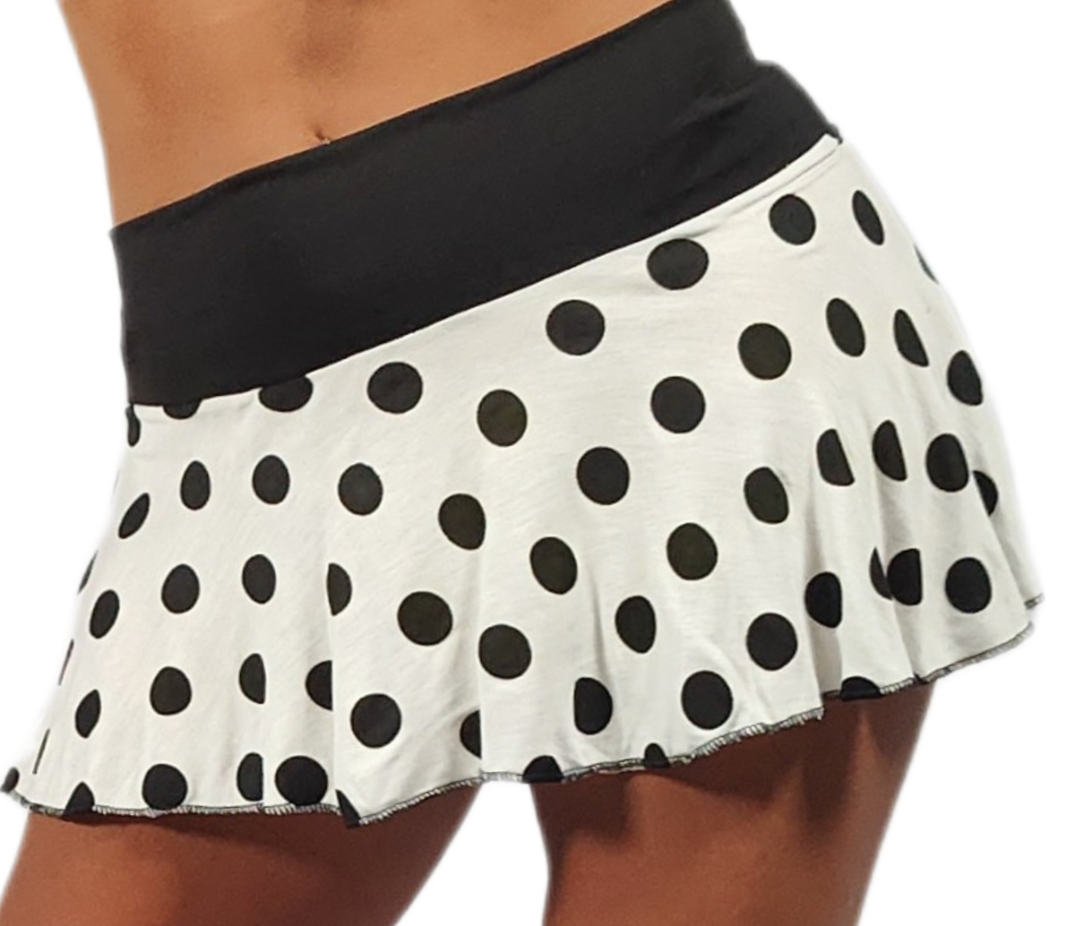 Hermosísima Mini confeccionada en lycra modal con Viscosa elastizada, fondo Blanco con lunares negros y fajon! negro liso, tal cual la podes ver en cada una de las imágenes, es una de nuestras prendas temáticas, las llamamos así por qué no las sugerimos para el uso Cassual o urbano, si la podes llevar tanto para vestuario para show, cómo acompañando a la ropa interior o disfraz sexy, es una prenda delicada con impronta Pin UP por el estampado de la misma.