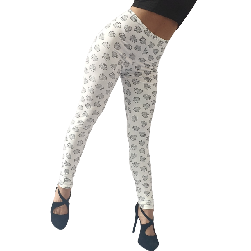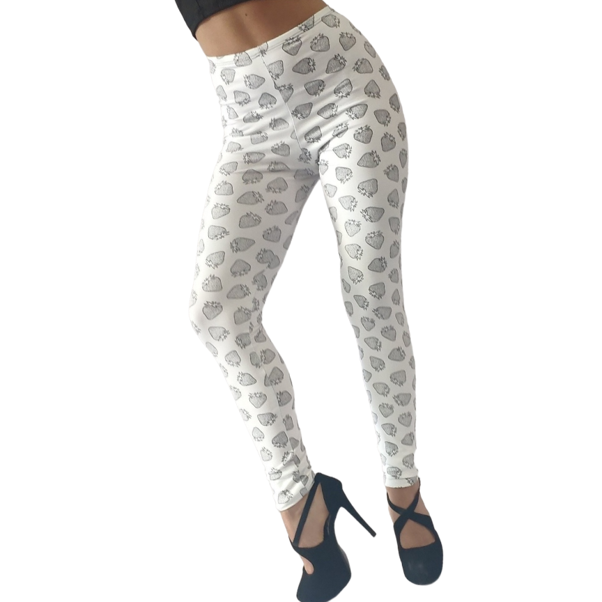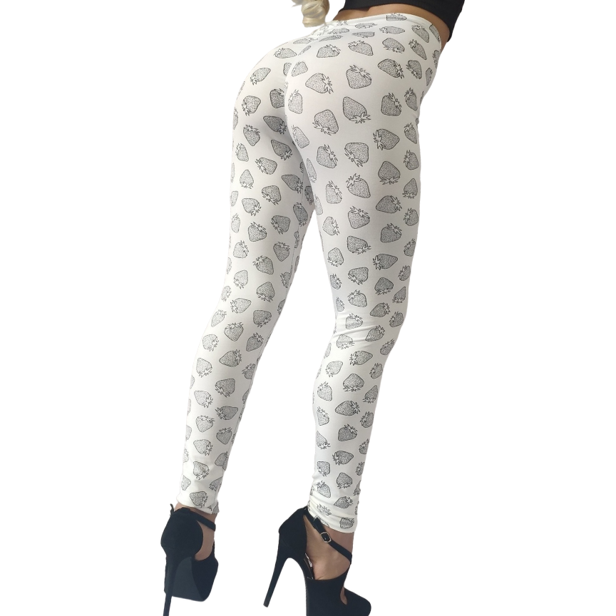 Bellísima Calza Blanca, confeccionada en lycra suplex estampado contorno frutillas, con detalle de Cola Drapeada Efecto Push Up, marcando y destacando el volumen natural de la prenda, Sexy, atractiva y muy sentadora.